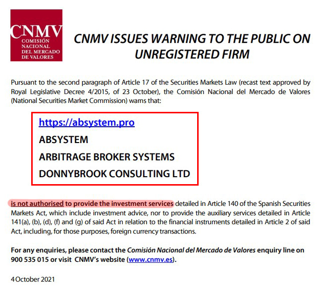 Arbitrage Broker Systems или ABSystem — это мошеннический веб-сайт, управляемый оффшорной компанией Donnybrook Consulting. ABSystem — нерегулируемая организация. Когда брокер не регулируется или регулируется организацией за пределами вашей юрисдикции, вы не имеете права обращаться в суд в случае потери ваших средств. Кроме того, ABSystem уже внесен в черный список следующими европейскими регулирующими органами: