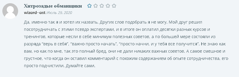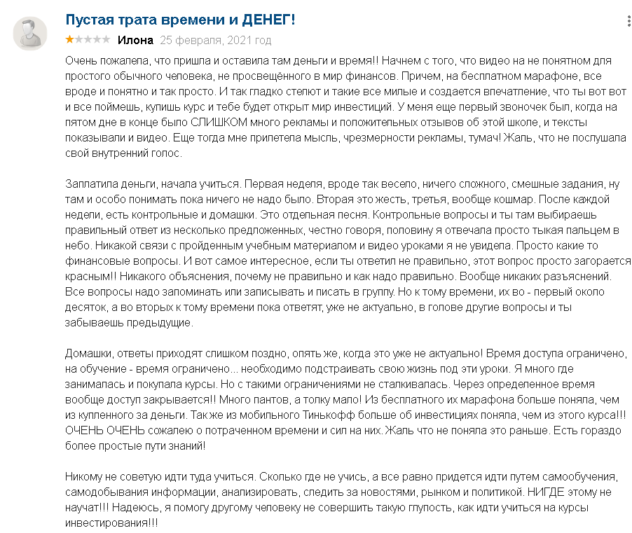 В социальных сетях и на сайте Fin Ra масса положительных отзывов, но давайте почитаем что пишут на других платформах. В комментарии ниже говорится что в курсе очень много «воды» и очень мало сути, пройдя десятки курсов вы ничему не научитесь, а оставив негативный отзыв на сайте, его тут же удаляют.