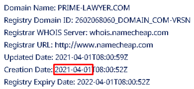 Если прошлый проект мошенники вели с 2019 года, то Прайм Юрист захотели разрекламировать больше, написав начало действия с 2014 года. Проверить срок действия домена не сложно, что мы собственно и сделали: