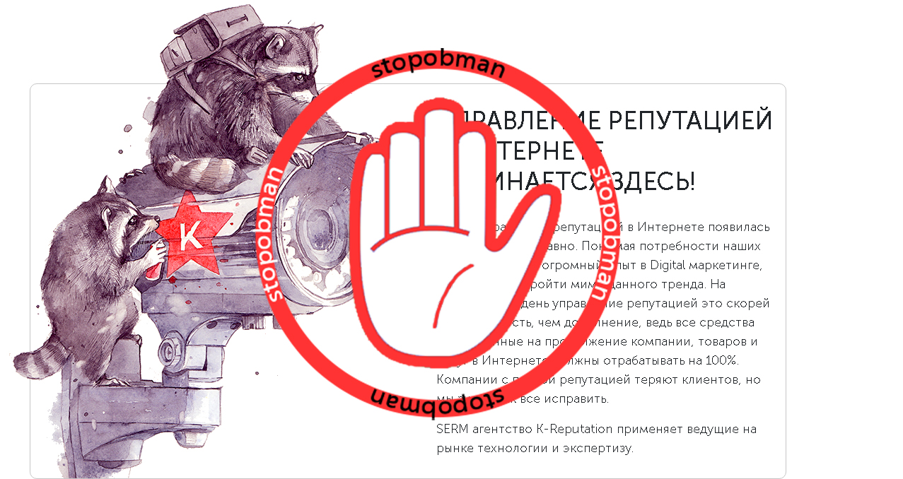 Просмотрев данную статью, вы можете сделать свои выводы, стоит ли доверять компании K-Reputation. Фальшивые отзывы на сайтах, неверный возраст домина, фирма близнец. Команда Stopobman не может рекомендовать сайт K-Reputation, выводы делать вам!