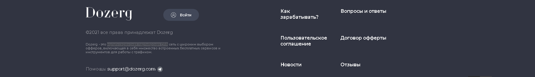 Dozerg –позиционирует себя как мультисервисная партнёрская CPA платформа. Если проще, то это предполагает, что вы просматриваете рекламу с сайтов партнёров, вам в свою очередь начисляются средства. Давайте рассмотрим информацию, про платформу которую предлагает нам сайт.