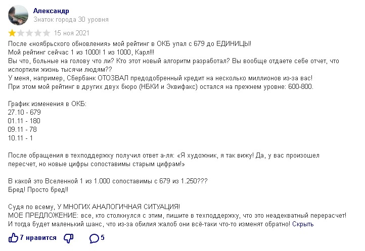 Алгоритмы не заработали на практике и случилось множество неприятных ситуаций, где людям с кристальной репутацией опустили рейтинг в самый низ. Обращение в тех. поддержку не принесло свои плоды и у многих людей случилась аналогичная ситуация. О чем свидетельствуют заваленные негативные комментарии на различных сайтах-отзовиках.рейтинга.