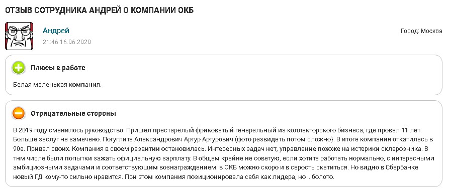 В компании творится полное бесчинство, в 2019 году сменили руководство, это очень повлияло на все дальнейшее развитие ОКБ. «Престарелый фриковатый генеральный из коллекторского бизнеса», – так теперь называют генерального директора Александровича Артура. Компания понемногу начала откатываться назад, утратила интересные перспективные задачи, развитие приняло обратный ход событий. Началась тотальная разруха, как в 90-е. Вот вам и бизнес коллектора. Хоть новое место, но методы управления прежние.