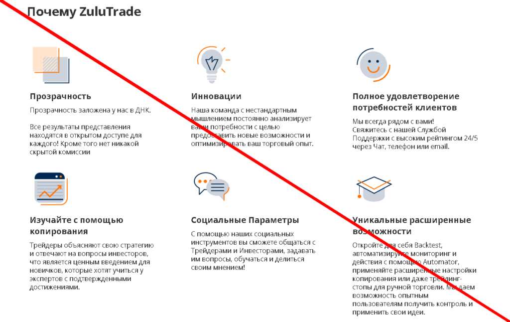 - Пункт 2.2.1: ZuluTrade никому не предлагает и не рекомендует проведение каких-либо транзакций либо использование финансовых инструментов. Но вся суть сайта ZuluTrade направлена именно на предложение использовать финансовые инструменты, копируя сигналы трейдеров. А как иначе понимать суть этой платформы? Получается, что платформа обманывает своих пользователей на сайте, ведь в правилах говорит о том, что никому ничего не предлагает. Сделано это затем, чтоб потом, в случае обращения клиентов суд, платформа могла ответить — мы никому ничего не предлагали, вот у нас в правилах это написано;