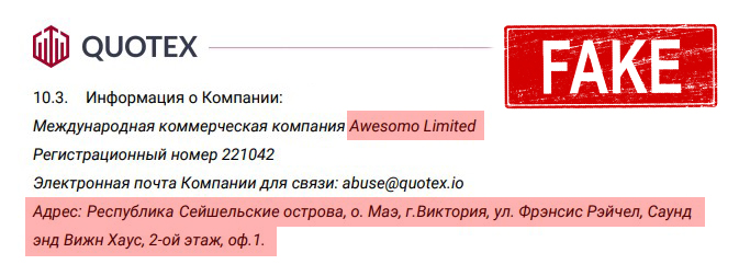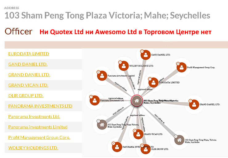 На сайтах quotex.com и quotex.io указан адрес 103 Sham Peng Tong Plaza Victoria, 1, Mahe, Seychelles. Всего два слова: оффшорная зона. На компании, зарегистрированные в офшорах российское законодательство не распространяется. Что бы не предприняла организация, как бы ни обманывала клиентов, вменить ей будет нечего. Так как адрес регистрации вне юрисдикции РФ.Но даже с офшорной регистрацией брокер Quotex нас обманывает. Дело в том, что по указанному адресу находится торговый центр. Всего десять организация арендуют в ТЦ помещение под офис. Список этих компаний находится в открытом доступе. И никакого брокера Quotex LTD в этом списке нет!