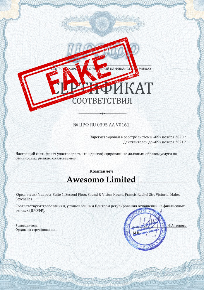 Отдельно хотим отметить сертификат ЦРОФР, который мошенники (а мы в этом уже уверены) выдают за лицензию. Организация ЦРОФР (Центр регулирования отношений на финансовых рынках) никакого отношения к финансовому регулятору, которым является Центральный Банк, не имеет. Как не имеет никакого отношения к Министерству финансов и другим правительственным организациям. Это сомнительная организация, которая скрывает людей, занимающих руководящие должности. Поэтому само наличие сертификата ЦРОФР косвенно подтверждает статус брокера как мошенника. Многие компании из «чёрного списка» получили эти «сертификаты соответствия».