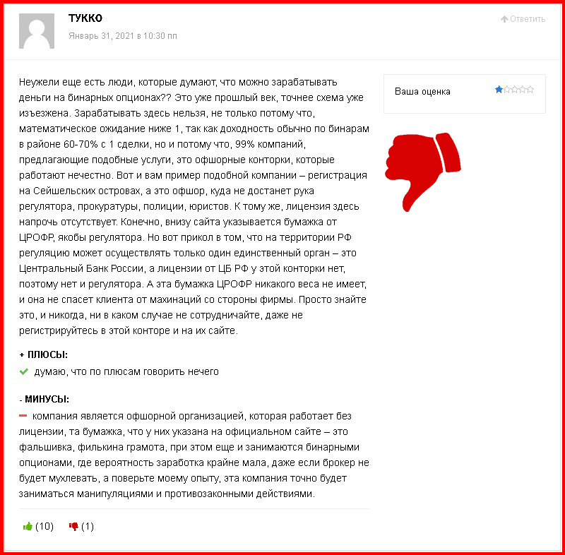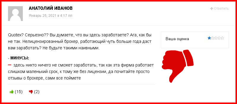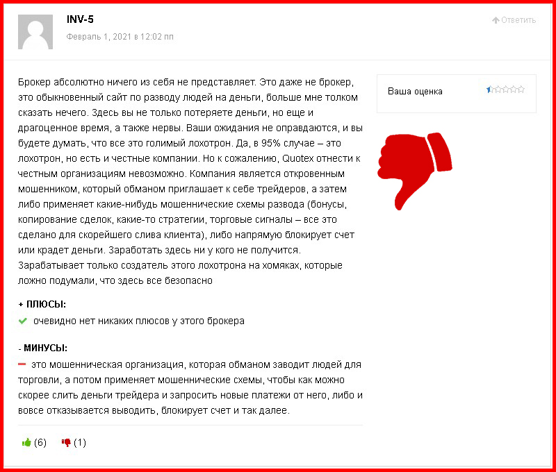 Какую бы информацию о брокере мы не проверяли, везде обнаруживаем обман и подлог. Quotex пытается выдать себя за легальную компанию, но в действительности такой не является. Утешает лишь тот факт, что не все трейдеры поверили в легенду мошенника. Многочисленные негативные отзывы тому подтверждение. И если вы всё ещё не передумали и хотите подарить свои деньги жуликам и аферистам, то почитайте отзывы других трейдеров. Надеемся, это убережёт вас от опрометчивых поступков.
